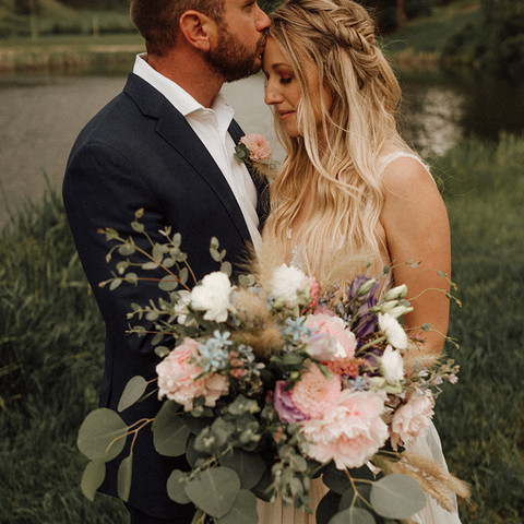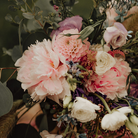 We are head over heels in love with color combinations we created for this elopement, starting with the Bridal Bouquet. The soft blush, purple, and blue tones made this bridal bouquet the perfect compliment to the wedding dress. These color combinations are something that are not only fun, but allow couples to show their own style and unique personalities. So many times I have couples afraid to want to add pops of color - and I say GO FOR IT! The best part for me, I grow the blush pink peonies right in my yard in Montana.