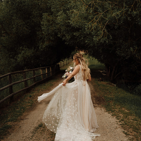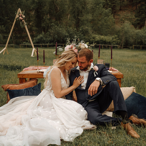 It was so fun working with Ashley J Photo to set the mood for this Starry Montana Elopement. We came across the gorgeous dress that our bride is wearing and knew we had to plan a styled shoot with it at the center. Who doesn't love chiffon and hand sown star lace?! The Esther, celestial inspired wedding dress is from Daci Gowns. What we loved about this dress was the way the wind caught it and made for ALL the magic. This dress features silk chiffon that’s rushing down the top and draping on the skirt. The skirt has 3 layers of silk organza, each layer a different color to mimic the colors of the sky at sunset. Over the organza there is one layer of the stars lace. The dress has a front opening and is super light. It’s a dream to wear it. I could not have wished for a more perfect dress, AH-MAZING!!